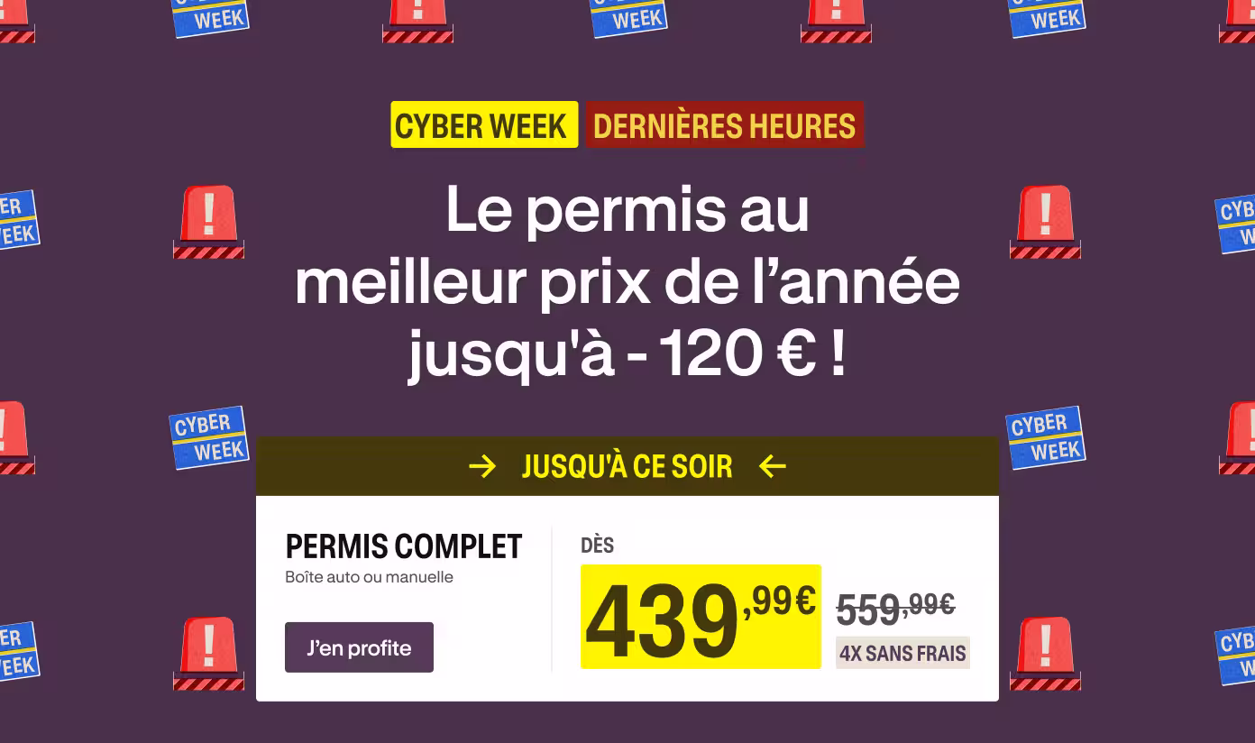 Promo Spéciale : Jusqu'à 120€ de réduction sur votre permis de conduire à partir du 24.11. Détails des conditions de l'offre
