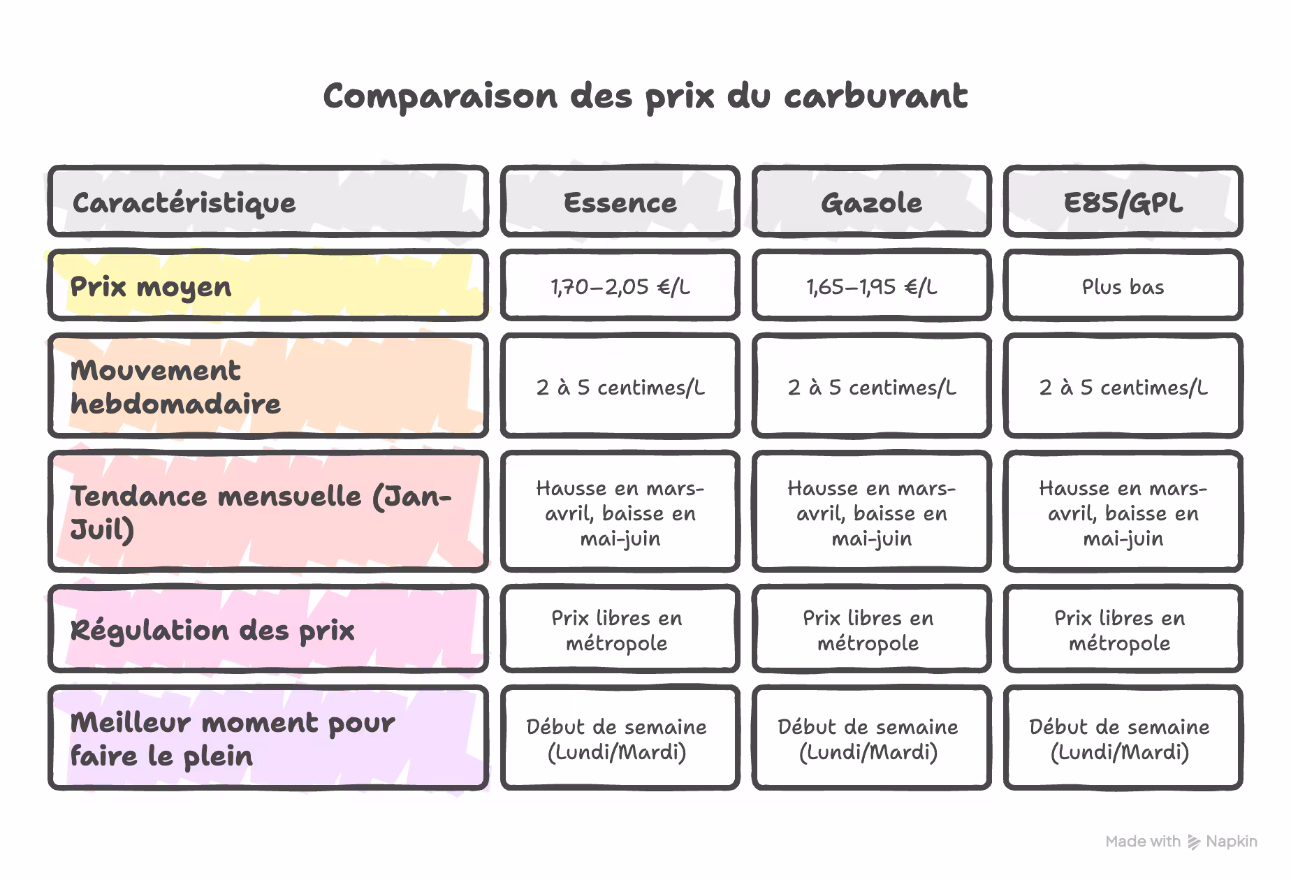 - La Réunion: tarifs plafonnés et révision mensuelle; en métropole, prix libres, écarts de quelques centimes selon région.