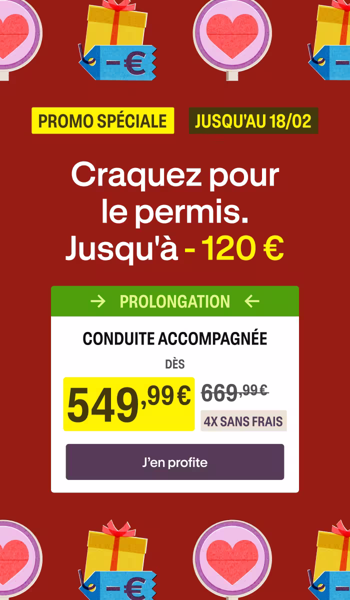 20h de conduite (boîte manuelle) ou 13h (boîte auto) avec un enseignant Ornikar. Objectif : atteindre un niveau suffisant pour circuler en sécurité et pouvoir démarrer la conduite accompagnée.