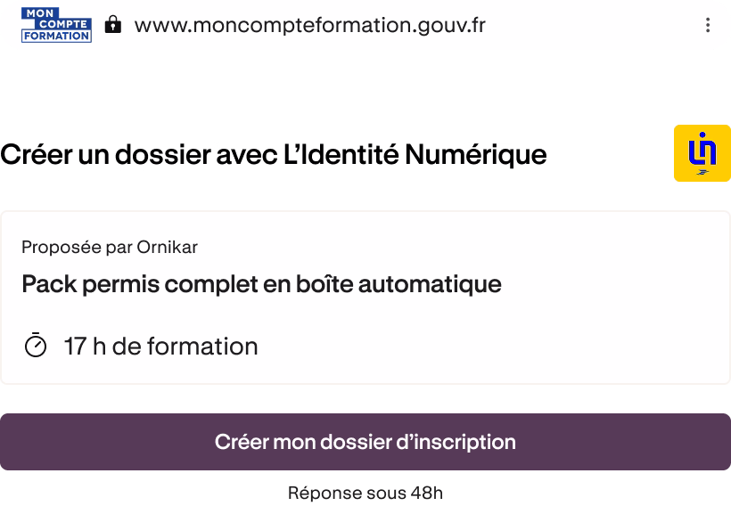 En cliquant sur "Créer mon dossier d'inscription" et je complète les informations demandées. Ma demande est validée par l'équipe Ornikar sous 2 jours ouvrés.